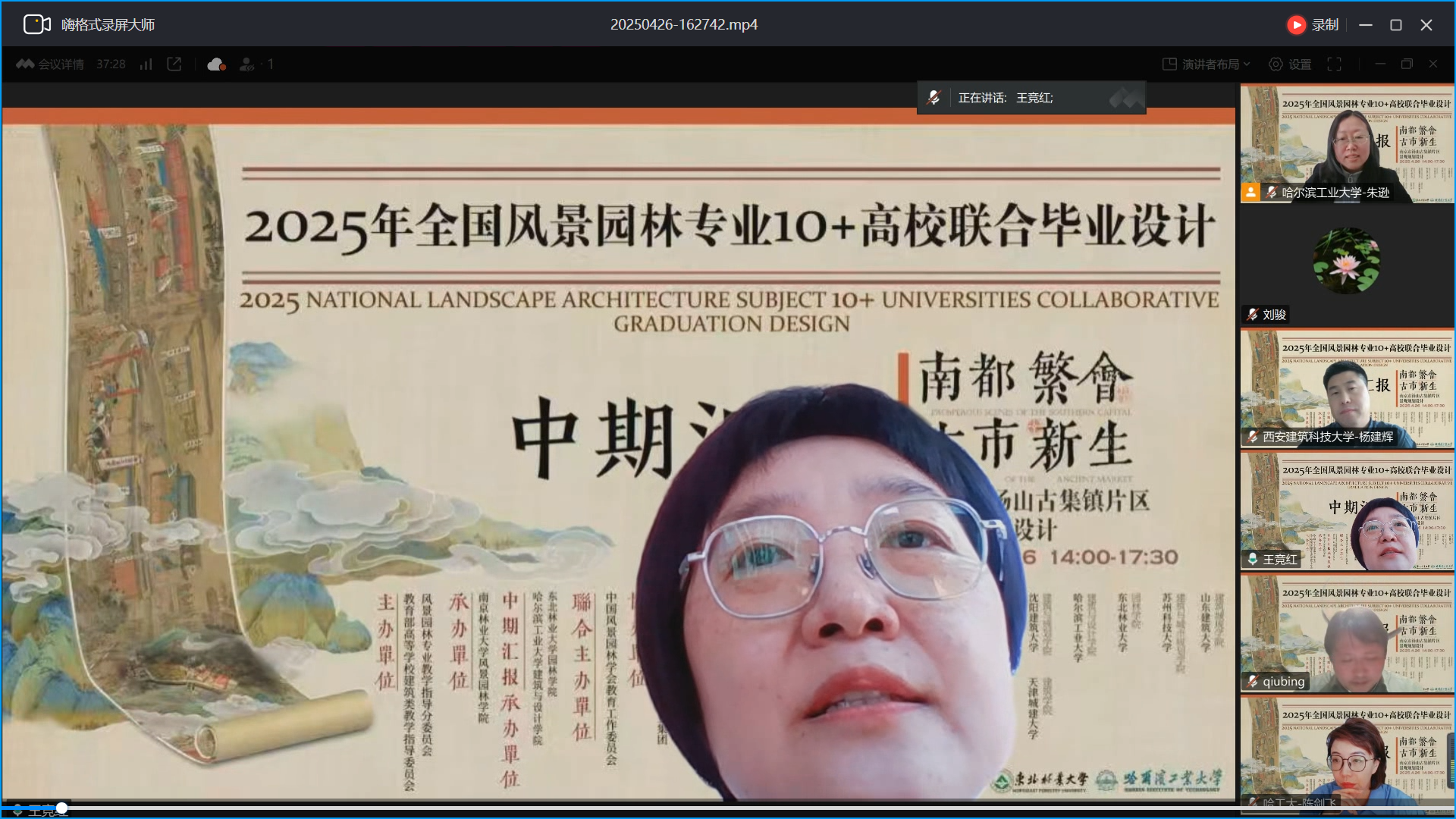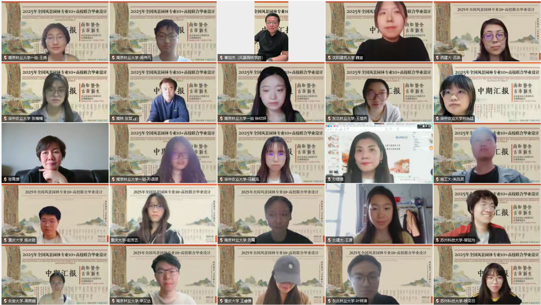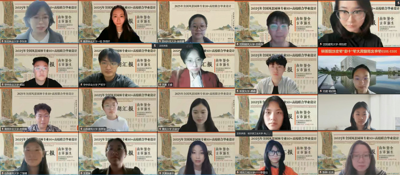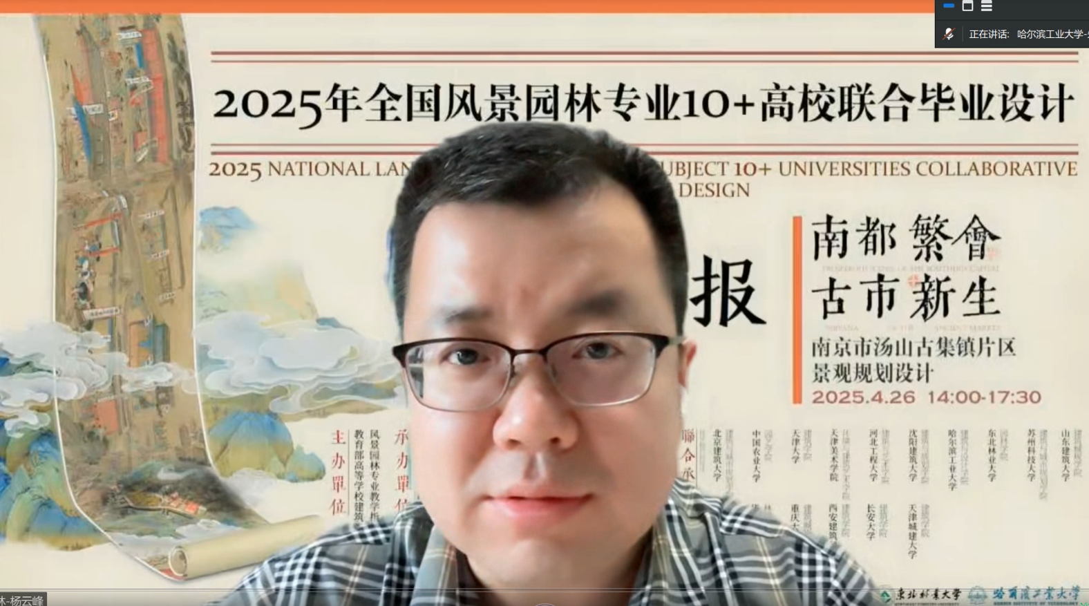 由教育部高等日本做爱建筑类教学指导委员会风景园林专业教学指导分委员会主办、日本做爱-台湾av-免费a片 承办、中国风景园林学会教育工作委员会支持、南京汤山温泉文化旅游产业集团有限责任公司特别支持的2025年全国风景园林专业10+高校联合毕业设计"南都繁会、古市新生——南京市汤山古集镇片区景观规划设计"中期汇报活动,于2025年4月26日顺利进行。本次中期汇报由日本做爱-台湾av-免费a片 、哈尔滨工业大学建筑与设计日本做爱 、东北林业大学园林日本做爱 共同承办,来自17所院校的19组联合毕设师生共同参与,相聚云端,通过线上平台展示各组精彩成果。