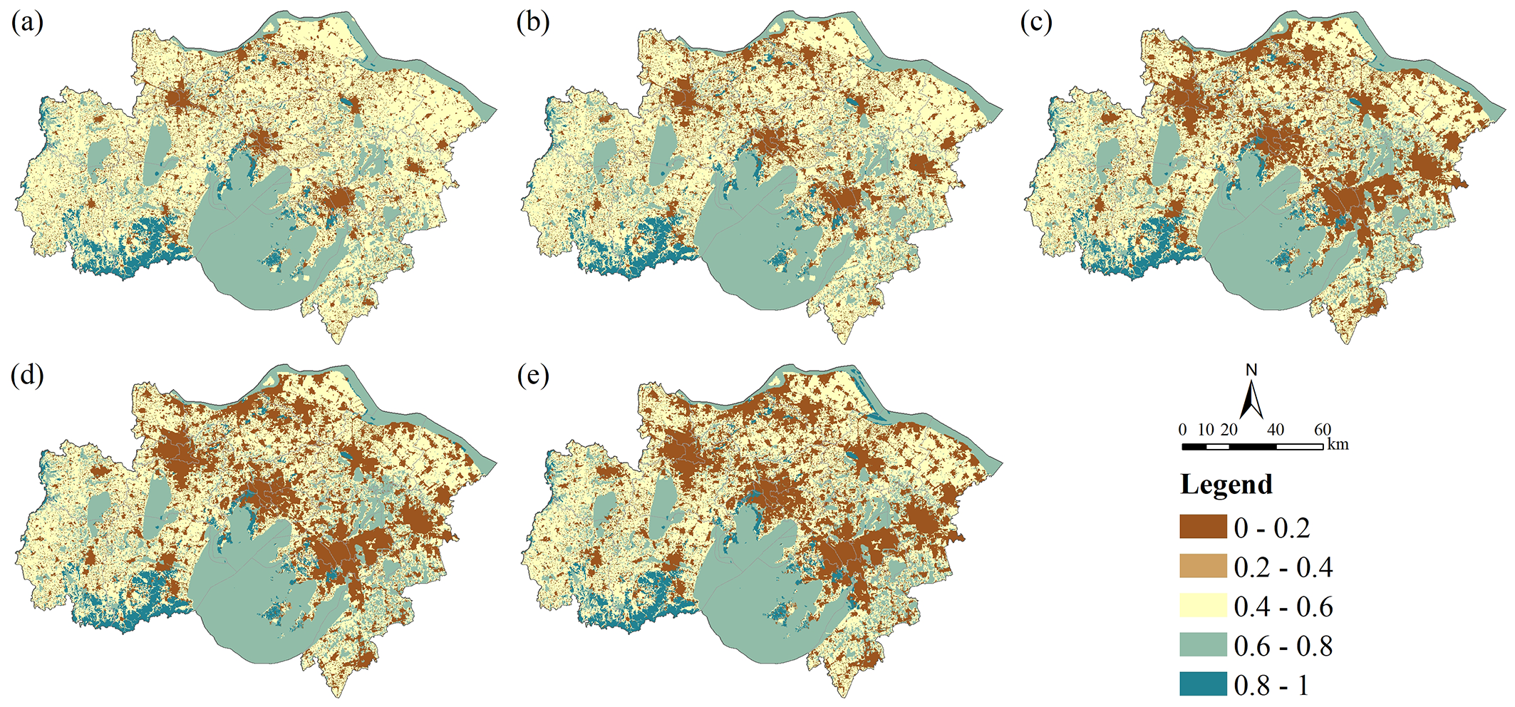 图2 太湖流域生境质量时空演变过程(a) 2000;(b)2005;(c)2010;(d)2015;(e)2020。